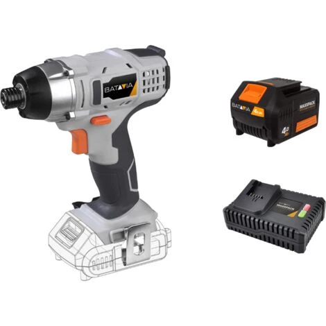 Un boulot difficile vous attend ? Pas de problème avec notre tournevis à percussion ! La visseuse à chocs sans fil BATAVIA 7062505 est idéale pour visser ou retirer de grosses vis et est si puissante que la plupart des travaux ne nécessitent pratiquement aucun effort. Vous utilisez principalement une visseuse à chocs pour les travaux de vissage plus intensifs. Par rapport à une visseuse sans fil, une visseuse à percussion prend tout son sens avec de grandes vis et des efforts plus importants en raison de la vitesse élevée et de la conception robuste. Grâce à la batterie Li-on 18V, la visseuse est sans fil et vous pouvez facilement l’emporter partout. Qu’est-ce que la plate-forme de batterie Maxxpack ?Cette visseuse à chocs est vendue avec batterie et chargeur. Le pilote d’impact fait partie de la plate-forme de batterie Maxxpack. Les batteries et chargeurs interchangeables peuvent être commandés séparément. Les avantages de la visseuse à chocs 18V : * Fonctionne sur batterie, pas besoin d’alimentation secteur * Vissage sans effort pour les vis longues et larges * Travaillez sans rebond avec un couple extra élevé * Porte-embout hexagonal universel * Contrôle de vitesse électronique dosé pour des travaux spécifiques Données techniques: * Tension de la batterie : 18V Li-Ion * Vitesse à vide : 2200 min -1 * Battements par minute : 3000 min -1 * Porte-embout : embout hexagonal 1/4 » (6,35 mm) * Couple : 150 Nm * Poids du produit sans batterie : 2,2 kg * Dimensions du produit (L × l × H) : 17 × 10 × 21 cm Qu’y a-t-il dans le paquet ? * 1 tournevis à percussion 7062505 * 1x embout à vis * 1x clip de ceinture * 1x batterie 4.0Ah * 1x chargeur rapide 4.0Ah * 1x manuel * 1x facture (certificat de garantie) Homologations/certificats :CE, EMC, HAP, RoHS, REACH Commandez directement en lignePrêt à ajouter ce pilote d’impact à votre collection d’outils ? Ensuite, vous pouvez passer une commande chez nous directement en ligne. Vous bénéficiez immédiatement de notre livraison ultra rapide et de notre excellente garantie. Combien d’années de garantie ?Il y a une garantie de 2 ans sur la visseuse à chocs BATAVIA 7062505, la batterie et le chargeur fournis. BATAVIADes outils de qualité innovants à un prix attractif ? Chez Batavia, nous développons des produits innovants et respectueux de l’environnement pour un usage professionnel et bricoleur. Les bons outils pour votre travail facilitent la vie et garantissent une finition professionnelle. « BATAVIA : Des outils pour construire !