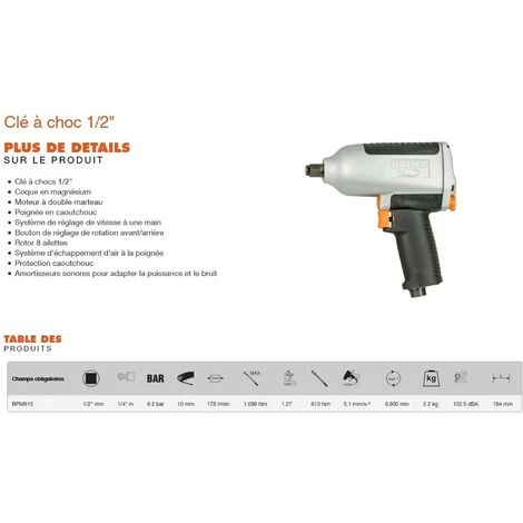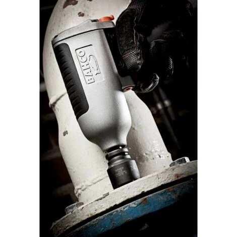Clé à chocs professionnelle avec bec court Bahco BPM915 Carter en magnésium pour un compromis optimal entre résistance et légèreté, poignée ergonomique confortable en caoutchouc. Bec à douille long pour une meilleure accessibilité, embout ½ pouce. Moteur à double marteau avec rotor à 8 ailettes. Bouton de réglage du régime de rotation accessible à 1 main. Caractéristiques : Pression optimale = 6.2 bar (diamètre de tuyau 10mm), Force = 813 à 1098Nm, Rotation jusqu’à 9800 trs/min. Nombreux modèles de clés à chocs Bahco disponibles en stock.