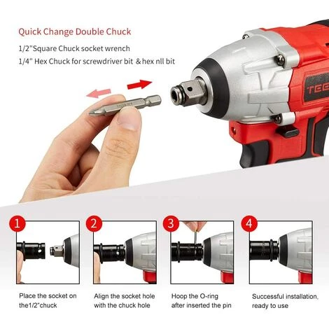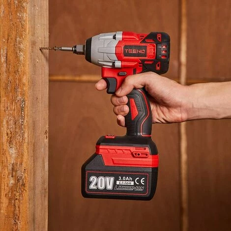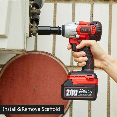 Ce que Vous Pouvez Obtenir: 1 × TEENO Clé à chocs sans fil, 1 × 3.0Ah Batterie Li-ion, 1 × Chargeur rapide, 5 × Clé à douille (18/19/19/20/22mm),6 × vis bits tête, 8× forets, 4 × Jeux de douilles, 1 ×Arbre à cardan, 24× Mois de garantie.