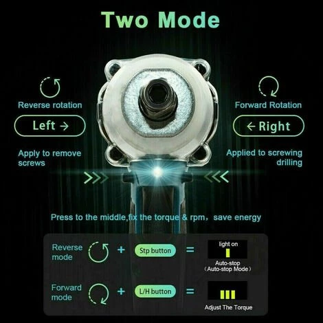 - -Mode d’arrêt automatique pour la rotation inverse arrête l’impact (le mode ne fonctionne que lorsqu’il est tourné dans le sens inverse des aiguilles d’une montre) et la rotation en 0,1-0,2 secondes après que la vis / l’écrou a été suffisamment desserré.