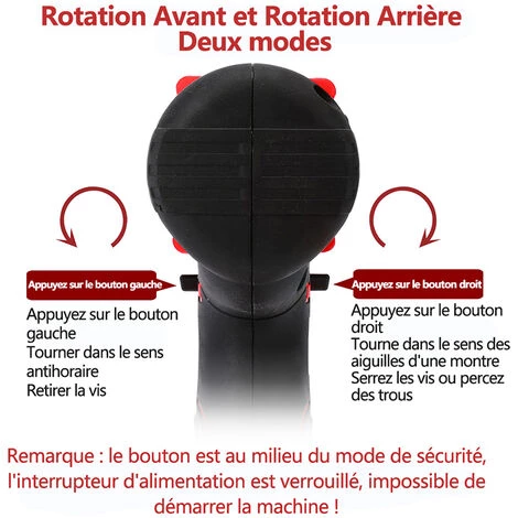 Commutateur avant/arriere: Positionnez le selecteur de rotation a gauche de la gachette pour la rotation avant et a droite pour la reservation. Positionnez le selecteur au centre pour verrouiller la gachette et empecher un demarrage accidentel lorsqu¡¯il n¡¯est pas utilise.