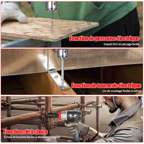 1. OUTIL POLYVALENT – Le mandrin rapide et la clé de 1/2 pouce et 5/16 pouce combinent les caractéristiques d’un tournevis électrique, d’une clé à chocs et d’une perceuse ; ce qui peut remplacer un kit combiné de perceuse sans fil. Clé à chocs de 1/2 pouce – pour les boulons et les écrous ; Tournevis sans fil – la pince de serrage accepte une mèche de 1/4 pouce pour visser ; Perceuse sans fil – pour percer avec une mèche hexagonale de 1/4 pouce.Tournevis à chocs – idéal pour la rénovation de la maison, les projets de construction, l’entretien de l’équipement industriel ou des pièces de rechange, et la réparation des motos.