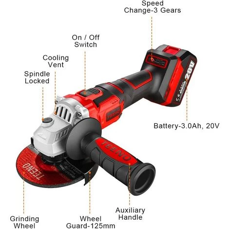 meuleuse d’angle la vitesse jusqu’à 9800 tr / min qui offre un traitement efficace pour les applications de coupe et de meulage professionnellesD’ailleurs,avec une conception innovante de l’évent permet d’éviter la poussière et les débris pour de meilleures performancesLED &2×3.0Ah Batteries Une poignée ergonomique souple assure une prise confortable;