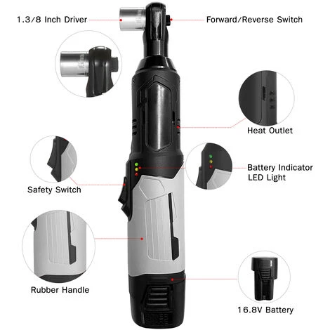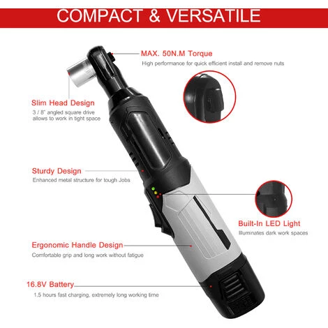Clé haute performance – Un puissant moteur de 16,8 V peut fournir jusqu’à 50 N.M de couple et produire une vitesse de 240 tr/min pour retirer ou installer des vis. Cela augmentera votre efficacité de travail et vous fera gagner du temps avec une clé à cliquet électrique.