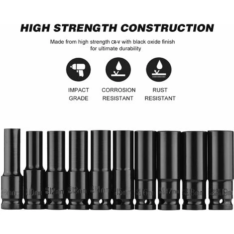 Les douilles en acier au carbone à haute résistance peuvent supporter plus de couple des outils à impact. La finition en oxyde noir offre une protection maximale contre la rouille et la corrosion, assure une longue durée de service.